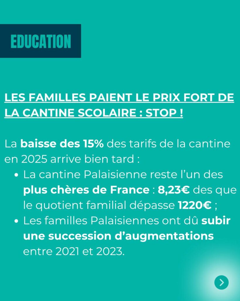 ✨ À quelques mois des élections, la baisse de 15 % des tarifs de la cantine en 2025 arrive bien tard. Car oui, la cantine de Palaiseau reste l’une des plus chères de France : 8,23 € dès que le quotient familial dépasse 1 220 €, pour un repas dont le nombre de composantes a été réduit.